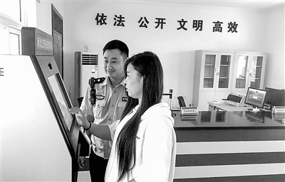 为进一步深化“放管服”改革工作要求,提升交管工作便利化水平, 7月1日起,香河县公安交警大队将六年内免检车辆核发检验标志、互联网用户注册、补换领驾驶证、补换领机动车行驶证和号牌、简易交通违法处理等交管业务下放至各乡镇交警中队,真正实现将便民利民服务送到家门口。图为香河交警指导群众自助处理交通违章。