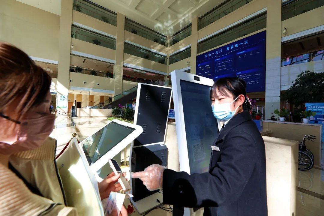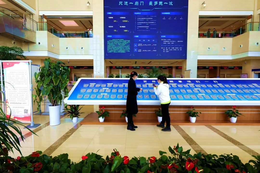 香河县便民服务大厅的工作人员指引群众扫描窗口的二维码。