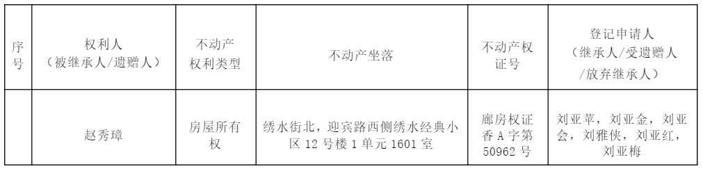 根据《不动产登记暂行条例实施细则》第十四条的规定,经初步查验,不动产登记机构拟对下列不动产权利办理不动产继承登记。根据《不动产登记暂行条例实施细则》第十七条的规定,现予公告。如有异议,请自本公告之日起15个工作日内,将异议书面材料送达不动产登记机构。逾期无人提出异议或者异议不成立的,不动产登记机构将予以登记。