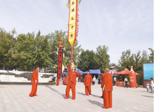 北运河香河中心码头,民间艺人在表演中幡。