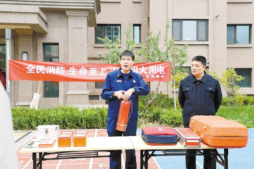 消防救援人员讲解灭火器使用方法。通讯员 李春杰 摄