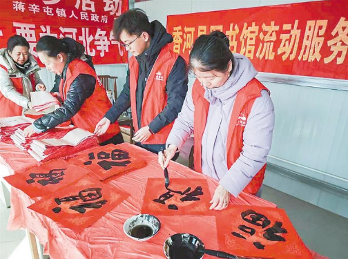 近日,香河县蒋辛屯镇联合香河县图书馆在该镇集贸市场举办“迎新春、送春联”文化惠民活动。活动现场,几张长桌一字排开,书法爱好者们凝神聚气、笔走龙蛇,一副副寓意吉祥的春联跃然纸上。此次活动弘扬了中华优秀传统文化,营造了喜庆祥和的节日气氛,将“文化年货”送到群众手中。