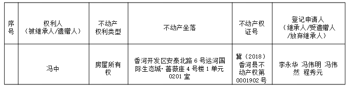 根据《不动产登记暂行条例实施细则》第十四条的规定,经初步查验,不动产登记机构拟对下列不动产权利办理不动产继承登记。根据《不动产登记暂行条例实施细则》第十七条的规定,现予公告。如有异议,请自本公告之日起15个工作日内,将异议书面材料送达不动产登记机构。逾期无人提出异议或者异议不成立的,不动产登记机构将予以登记。